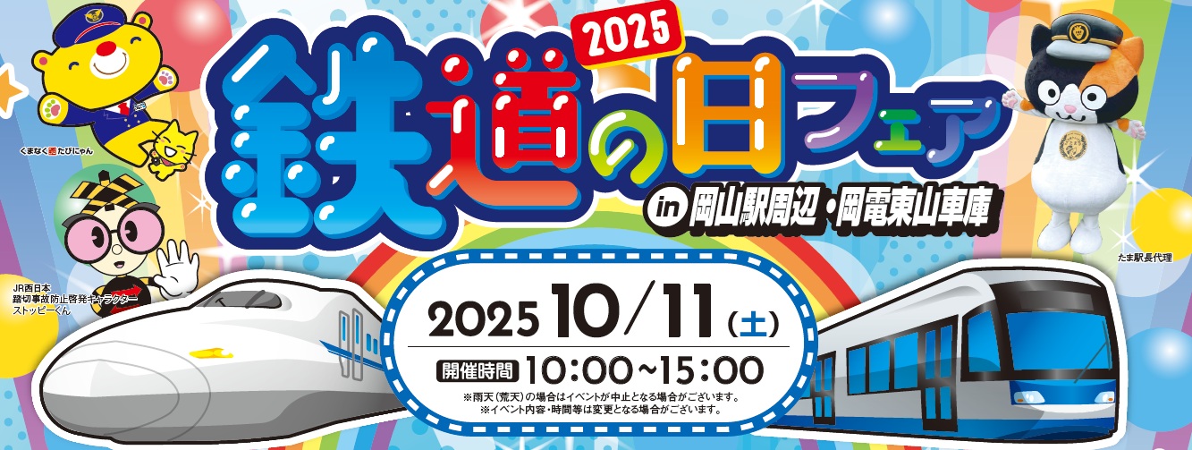 JR岡山支社と共催で、岡山にお越しのお客様や日ごろ鉄道をご利用のお客様への感謝の気持ちを表すイベント「2025 鉄道の日フェア」を共同で開催します。お子さまにもお楽しみいただけるイベントなどを多数ご用意しておりますので、ぜひご来場ください。