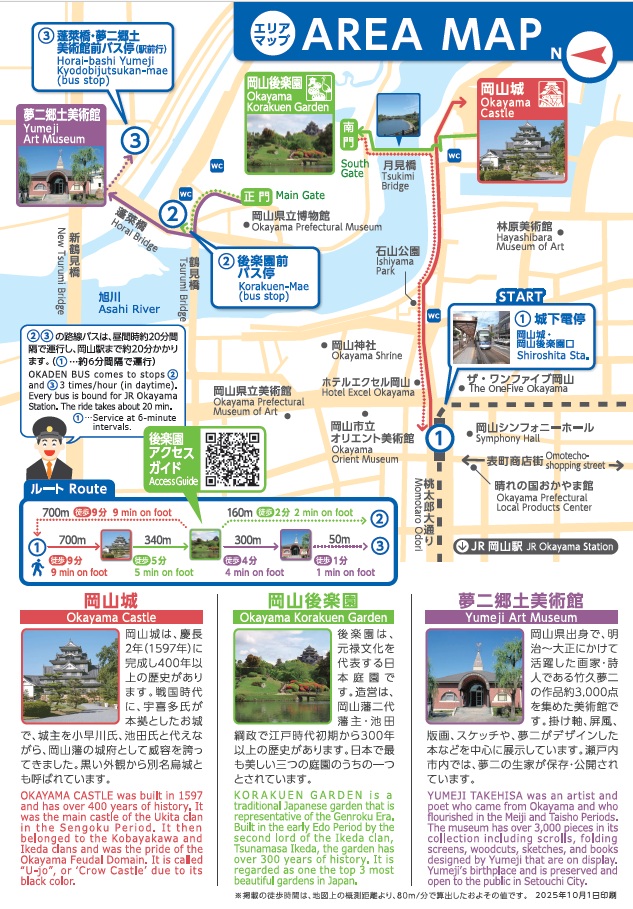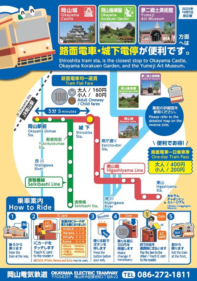 後楽園 岡山城へは、路面電車で城下電停が便利です 岡山駅前から「東山線」東山行にご乗車ください 清輝橋行は城下電停には行きません 東山線は進行方向に向かってホーム右前側から発車いたします 画像をクリックするとPDFファイルを開きます カルチャーゾーン
